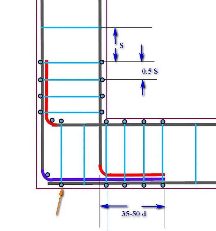 Правильно рассчитанные и соединённые углы уберегут зданий от непрогнозируемой усадки, трещин по всей площади стен и преждевременного разрушения. Во время установки прутья в углах загибаются, их укладка производится внахлёст. Между собой все количество стержней соединяется радиусным способом. Перекрытие стержней берётся с расчётом не более 25 см.