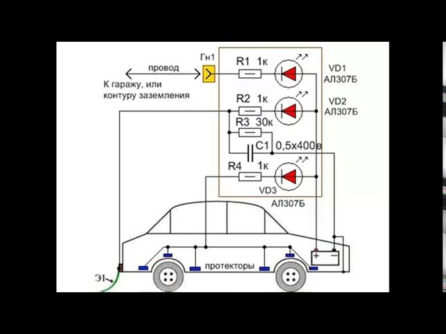 - Для автомобилей, находящихся в неподвижном состоянии, на роль катода подойдет расположенный вблизи металлический объект, например, гараж (при условии, что он построен из металла или имеет металлические элементы), контур заземления, который может быть установлен в отсутствии гаража на открытой стоянке.