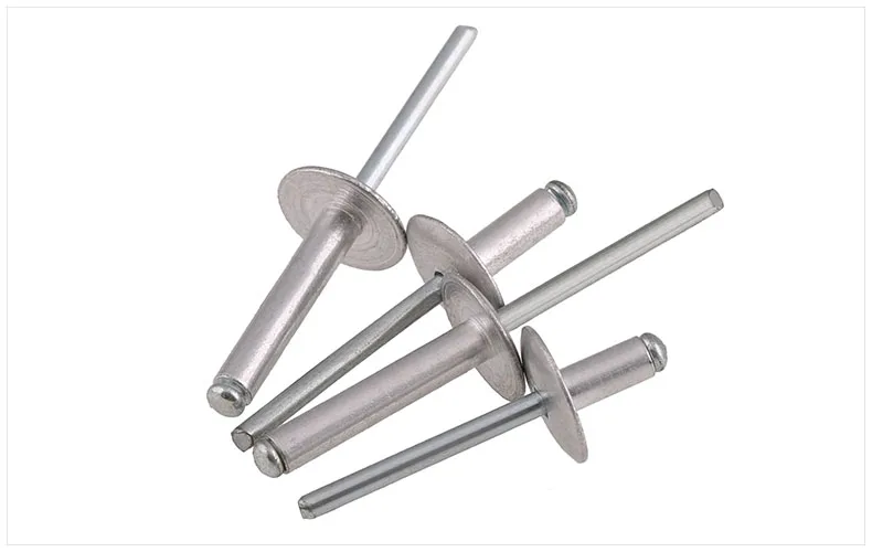- Вытяжные заклепки с большой или очень большой головкой : большая головка увеличивает опорную поверхность, что предотвращает поломку листов в случае хрупких материалов.