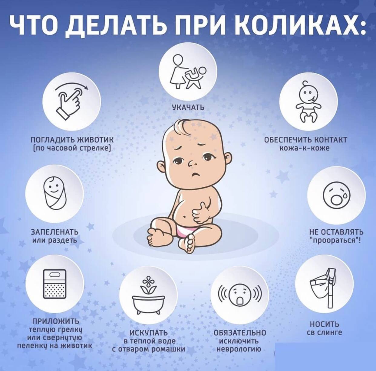 Существует несколько способов помочь ребенку при приступе колик:
