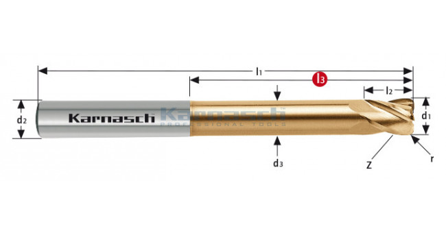 5-зубая конструкция этой цельной твердосплавной концевой фрезы с угловым радиусом для обработки сталей, инструментальных сталей и чугуна в паре с уменьшенной шейкой.