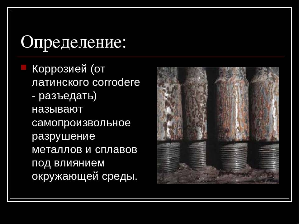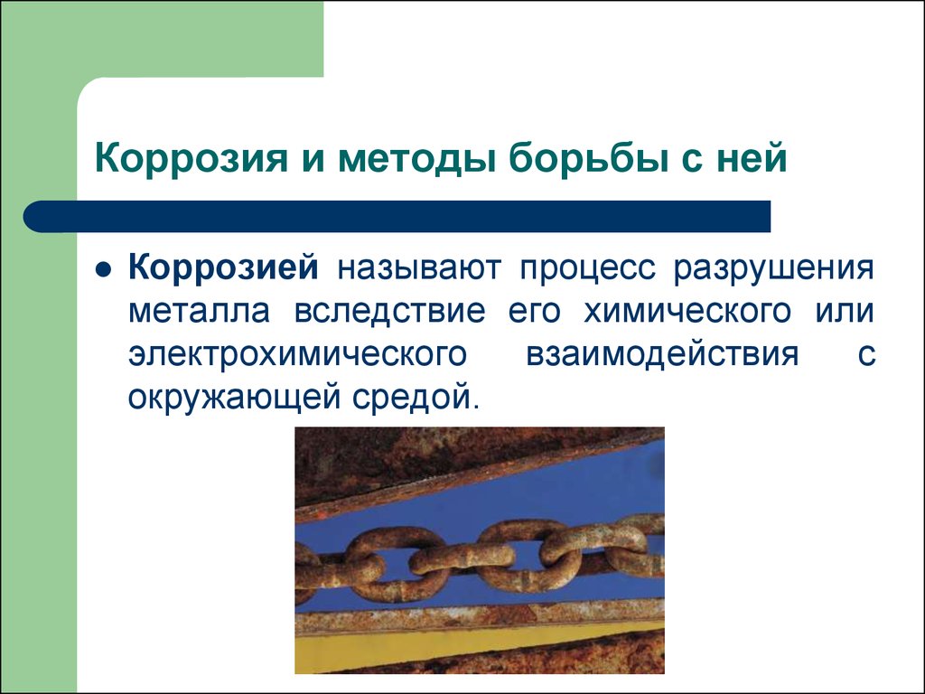 Коррозия — это постепенный износ металлов, вызванный действием воздуха, влаги или химической реакцией (например, кислотой) на их поверхность.