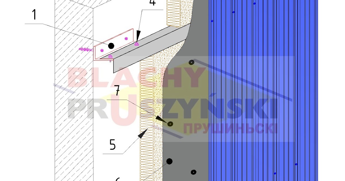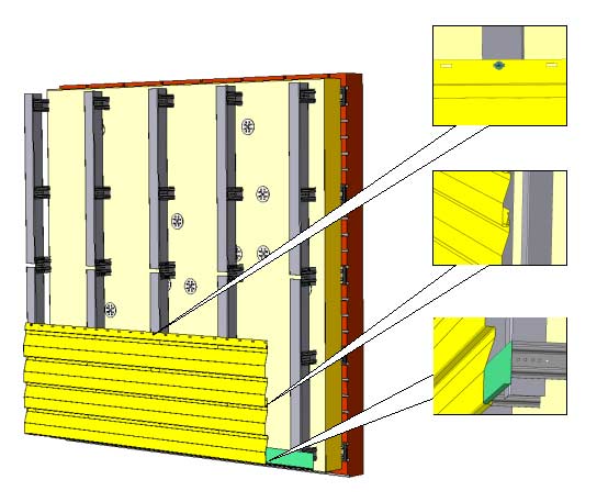 Для защиты утеплителя от ветра применяется ветровлагозащитная пленка. Далее к кронштейнам крепят вертикальные П-образные направляющие, крепление производят при помощи заклепок. С помощью направляющих выполняют выравнивание стены. Между направляющими и ветрозащитной плёнкой создаётся воздушный зазор. К вертикальным направляющим крепятся горизонтальные П-образные профили с шагом, необходимым для надежного крепления профлиста. Стеновой профлист закрепляют самонарезающими шурупами с уплотнительными прокладками.