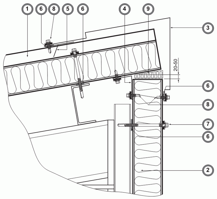 Поверх пленки, прижимая её к стеновой панели, монтируется шляпный профиль, закрепляясь к стойкам панели саморезными болтами. Монтаж профлиста на стену осуществляется самосверлящими болтами с уплотнительной прокладкой через одну волну в нижний прогиб. Вертикальные стыки профлистов закрепляются заклепками.