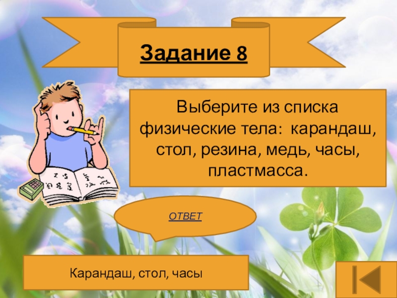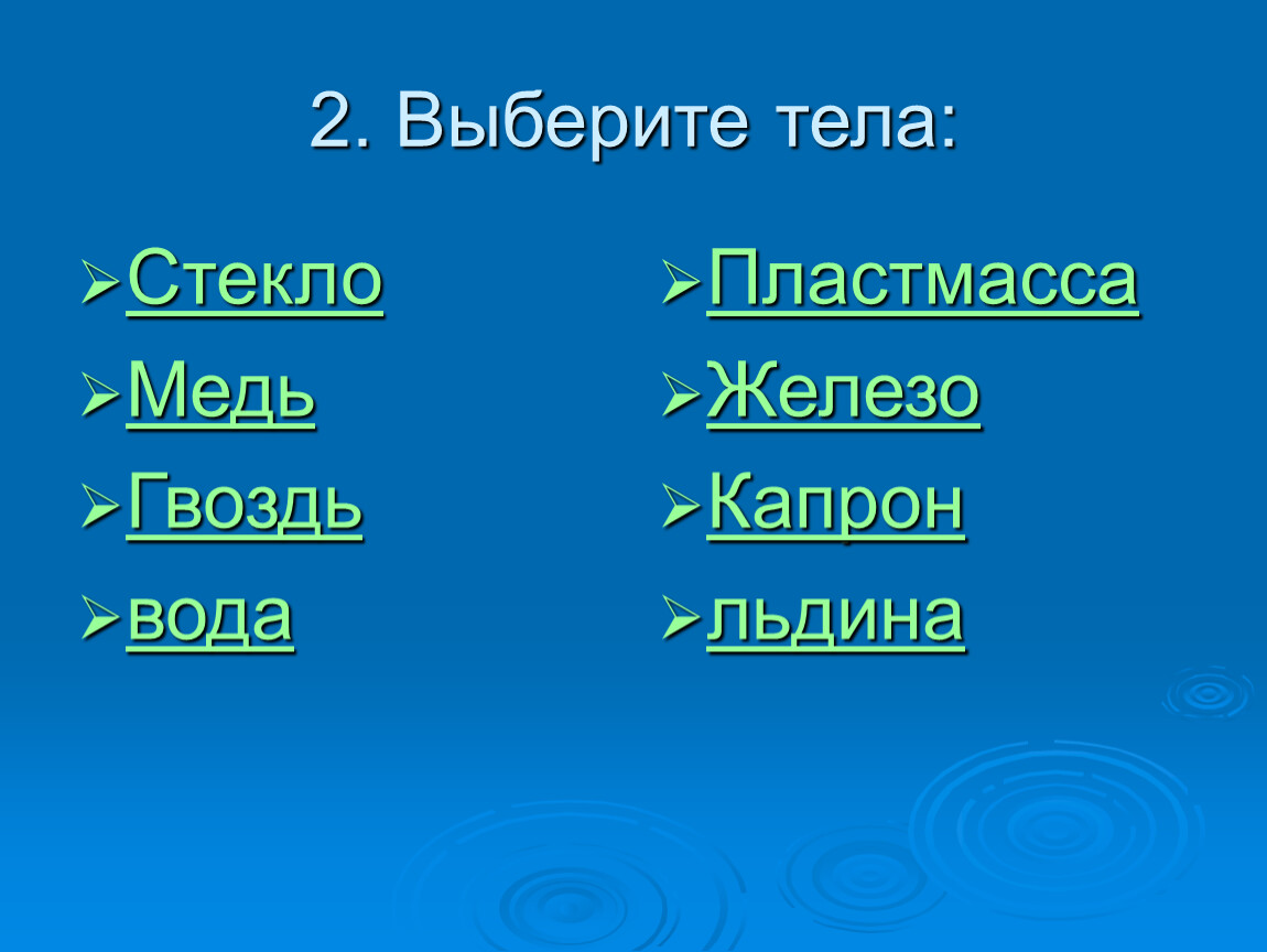 Задание 3 Из следующего перечня выпишите отдельно названия веществ и предметов (физических тел): железо, термометр, медь, капрон, ртуть, напильник, нож, сахар.