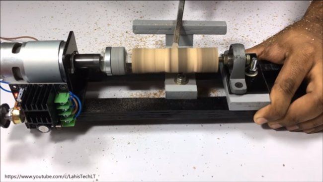Устройство работает так: перед началом работы происходит фиксация заготовки в шпинделе, в задней бабке надо установить патрон, в который будет вставлено сверло. На это место можно установить и центр, которым прижимается заготовка. Резец нужно расположить в суппорте мини станка.