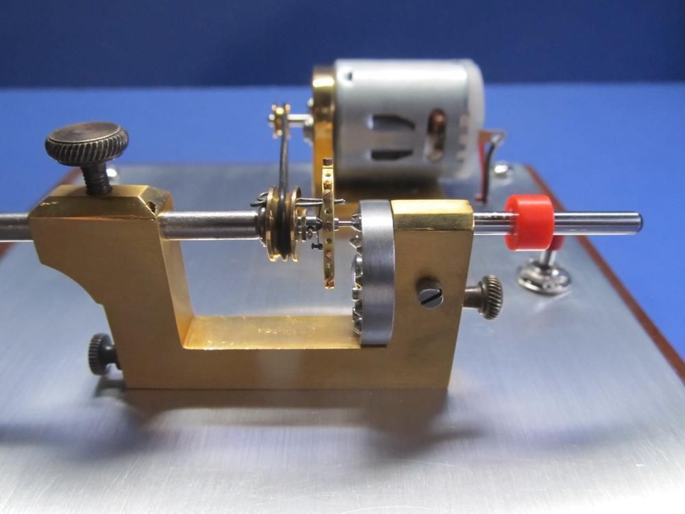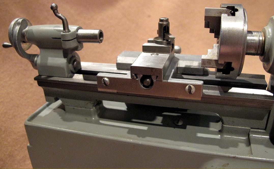 шпиндель передней бабки; внутренняя шестерня приводила в движение другую, прикрепленную к концу шпинделя, в то время как маленькая шестерня (на шпинделе) возвращалась вниз через составную цепь тонких часовых шестерен к 32 tpi. ходовой винт. К сожалению, поскольку шестерни привода ходового винта были зафиксированы на месте и не могли быть заменены, токарный станок не мог нарезать винты; даже в этом случае это должен быть самый маленький в мире серийный токарный станок, когда-либо оснащенный механизмом силового скольжения, при котором весь узел каретки перемещался вдоль станины.