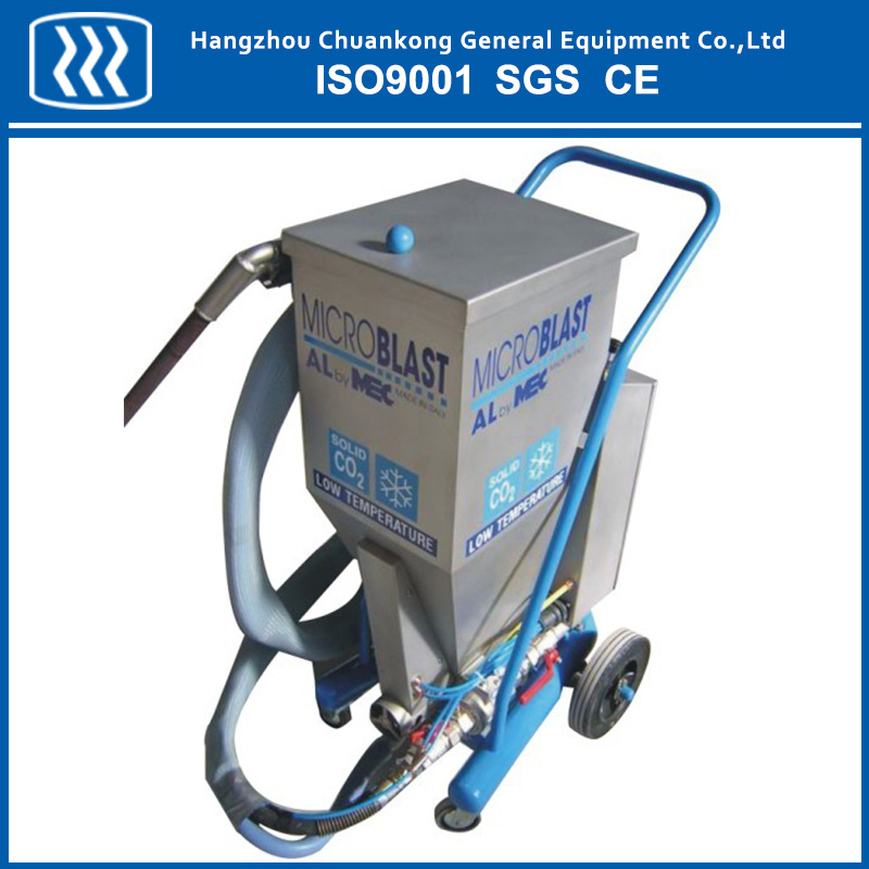 Аппарат для струйной чистки сухим льдом при помощи сжатого воздуха разгоняет гранулы размером до 3 мм до скорости, превышающей 150 м/с. Низкая температура (– 79 °C) обеспечивает замерзание и растрескивание слоя грязи, а высокая скорость гранул сухого льда – ее легкое отделение. Этот метод чистки позволяет эффективно удалять практически любые загрязнения без повреждения очищаемых объектов.