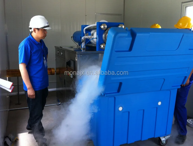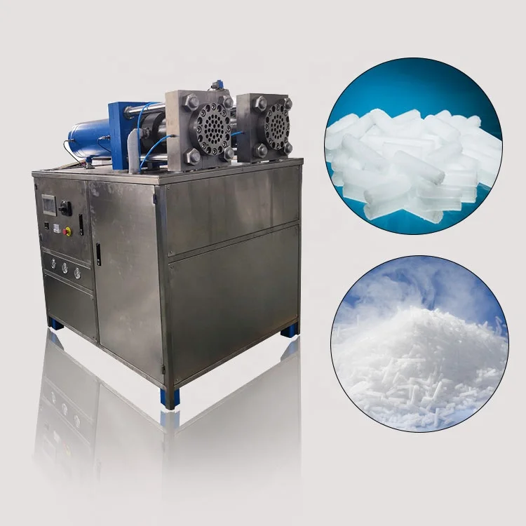 Процесс струйной обработки работает как быстрая декомпрессия жидкого CO 2 производит сухой лед, который затем сжимается в мелкие гранулы при температуре минус 79°C в температура. В процессе производства жидкий углекислый газ поступает в прессующий цилиндр гранулятора и за счет перепада давления превращается в сухой лед. Гидравлический цилиндр сжимает этот сухой ледяной снег, который затем продавливается через пластину экструдера. Это приводит к образованию стержней сухого льда, которые затем разбиваются на гранулы.
