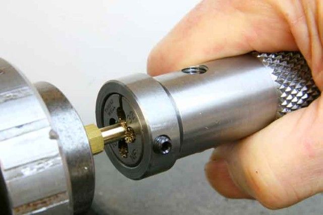 Для работы с инструментом используется патрон с плашкодержателем. Он устанавливается в пиноль задней бабки, располагается на одной оси с деталью.