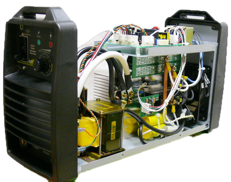 Применение высокочастотных преобразователей позволило снизить вес и размеры сварочных аппаратов. Электронная «начинка» дает возможность с высокой точностью регулировать и поддерживать на необходимом уровне параметры электрической дуги. Основными элементами инверторов являются диодные мосты, транзисторы (MOSFET или IGBT) и платы управления. Они делают конструкцию устройств достаточно сложной, но удобной в использовании. Для поддержания высоких эксплуатационных качеств аппаратов используются электронные системы управления и контроля работы мощных транзисторов, параметров питающей сети и выходного тока.