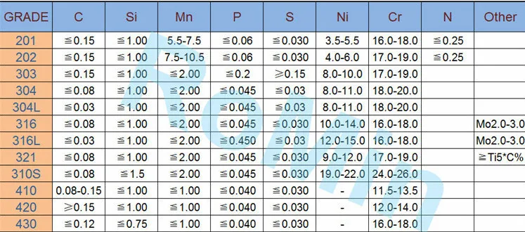 Марки нержавеющей стали классифицируются на основе доли каждого элемента, который они содержат. Процент железа, хрома, никеля, молибдена и углерода помогает определить сорт нержавеющей стали. В нержавеющую сталь добавлены дополнительные элементы для достижения различных свойств, таких как повышенная коррозионная стойкость, устойчивость к низким температурам, устойчивость к высоким температурам, улучшенная свариваемость, повышенная прочность и т.