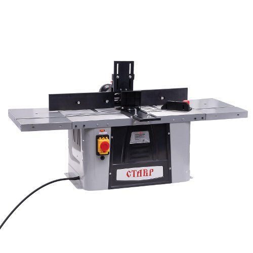 Рабочий стол отлит из чугуна., 2 удлинителя стола, Регулировка скорости вращения фрезы, Регулируемый фронтальный упор, Угловой упор в комплекте, Цанги 6 мм, 8 мм, 12 мм в комплекте, Удобная регулировка подъема фрезы, Предусмотрено подключение пылесоса для сбора стружки