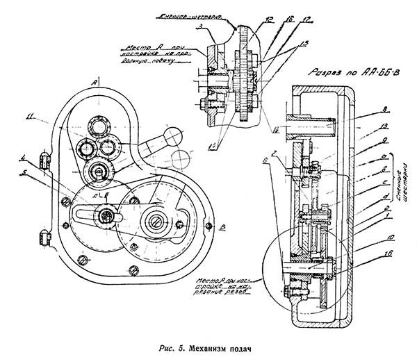В конструкции агрегата имеется механизм подач, который позволяет задавать параметры для нарезки резьбы и скорость осевой подачи. Параметры регулируются посредством связи неподвижного зубчатого колеса, которое находится в коробке подач, и планетарной передачи, расположенной на ходовом винте. Подобная схема позволяет в 30 раз снизить число оборотов, которые совершает ходовой винт.