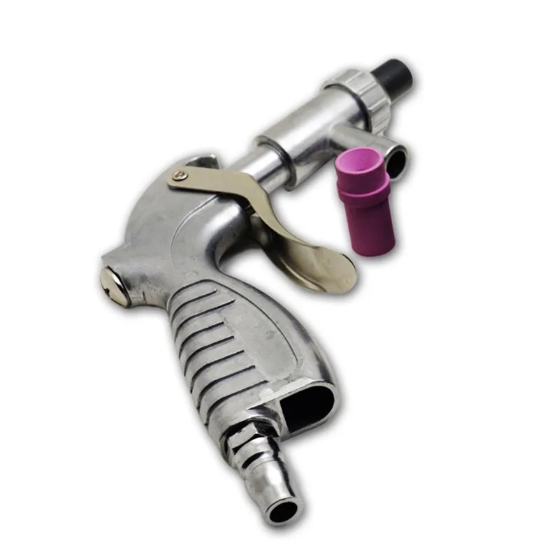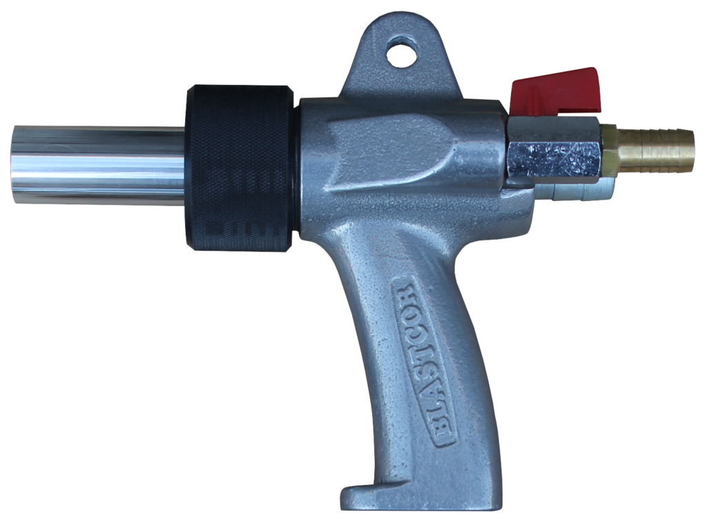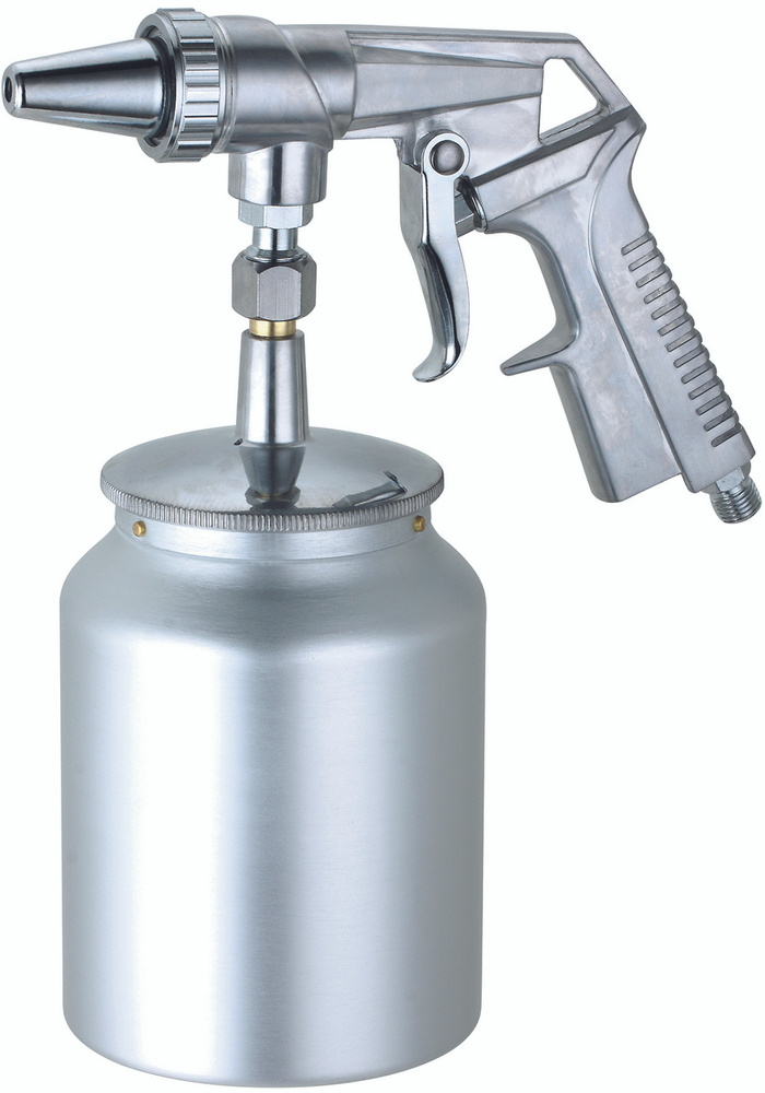 Контейнер для этих пескоструйных аппаратов расположен под пистолетом, а не сверху. Давление воздуха, проходящего через пистолет, создает всасывание, и среда в контейнере захватывается им и выбрасывается наружу.