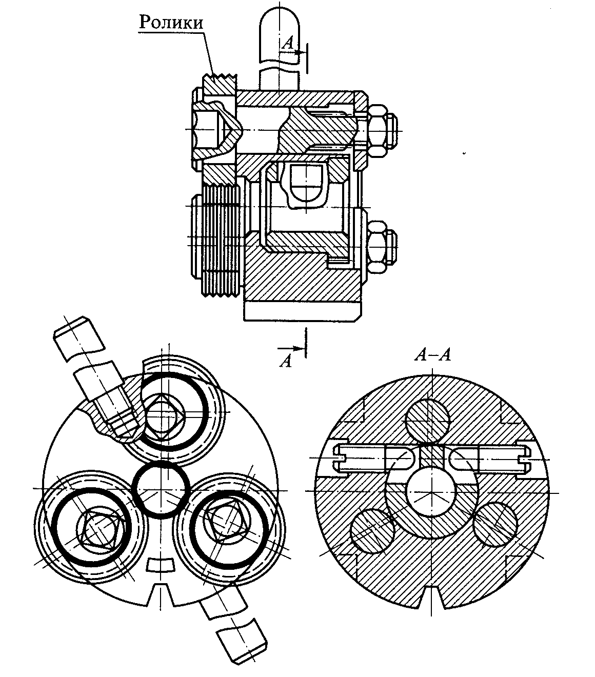 Плашки со сквозной подачей спроектированы без угла опережения (угол = 0°), чтобы деталь могла подавать. Профиль их выполнен с кольцевыми канавками таким образом , оси плашек установлены под углом, равным необходимому углу захода резьбы изделия. Кроме того, угол в плане плашки имеет ту же сторону, что и резьба заготовки – плашки с правым шагом производят правую резьбу .