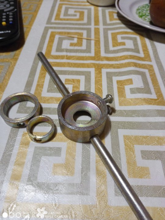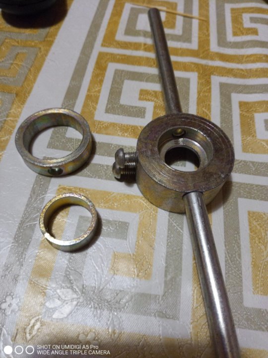 На последнем этапе работ нужно будет приварить направляющую втулку к ранее изготовленной металлической шайбе. Потом приспособление прикручивается к заводскому плашкодержателю. И теперь самоделка полностью готова.