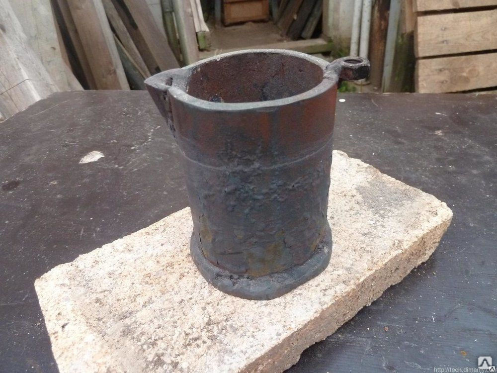 - Тигель — емкость, которая заполняется расходными материалами. Они плавятся во время нагревания. Затем мастер переливает расплавленные металлы в подготовленную заранее форму. Тигель изготавливают из глины или графита. Дополнительно используется жаропрочная обмазка, которая увеличивает долговечность емкости.