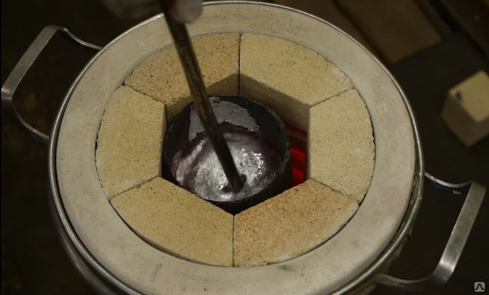 - Тигель вынимается из печи. На поверхности расплавленной латуни будет находиться плёнка, которую нужно убрать металлическим прутиком.