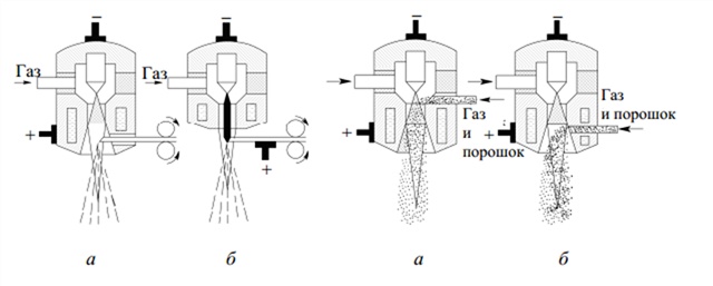Наиболее распространенные устройства, — это устройства с одним катодом и одним анодом, и с вводом порошка снаружи короткого сопла, перпендикулярно к оси пламени.