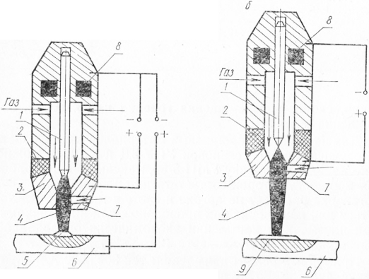 Как видно из схемы, короткое сопло плазматрона одновременно является анодом. Порошок вводится снаружи сопла перпендикулярно оси пламени, в непосредственной близости от дуги.