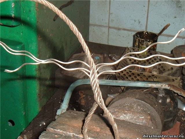 Трос для этого помещают на грань двутавровой или швеллерной балки и перебирают с помощью молотка. Или отсекают ненужные части отрезным кругом, если в наличии имеется угловая шлифовальная машина, и утилизируют. Все работы с тросом в целях безопасности рекомендуется производить в рукавицах или перчатках.