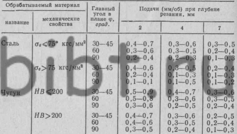 Приведенные подачи рассчитаны для обработки плоскостей с механической подачей. В случае обработки криволинейных поверхностей с ручной подачей приведены значения подач следует уменьшить на 20-30%.