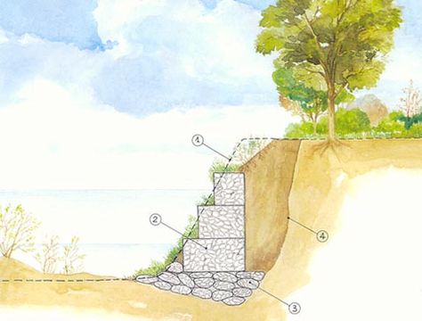 Клетки часто имеют ширину 3 фута и заполнены камнем, как указано дизайнером. Вместо заполненных камнем габионных каркасов можно использовать большие сборные железобетонные блоки.