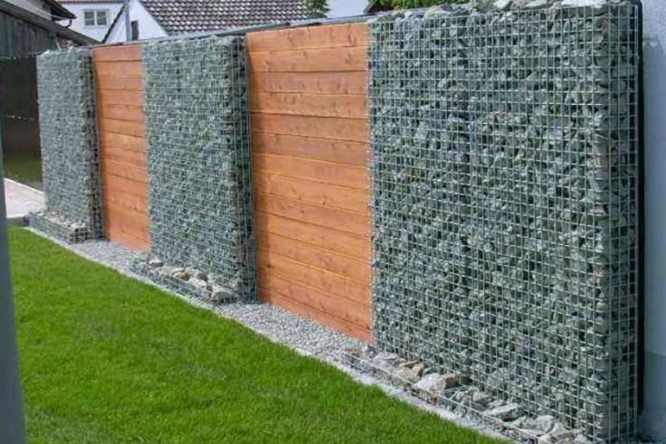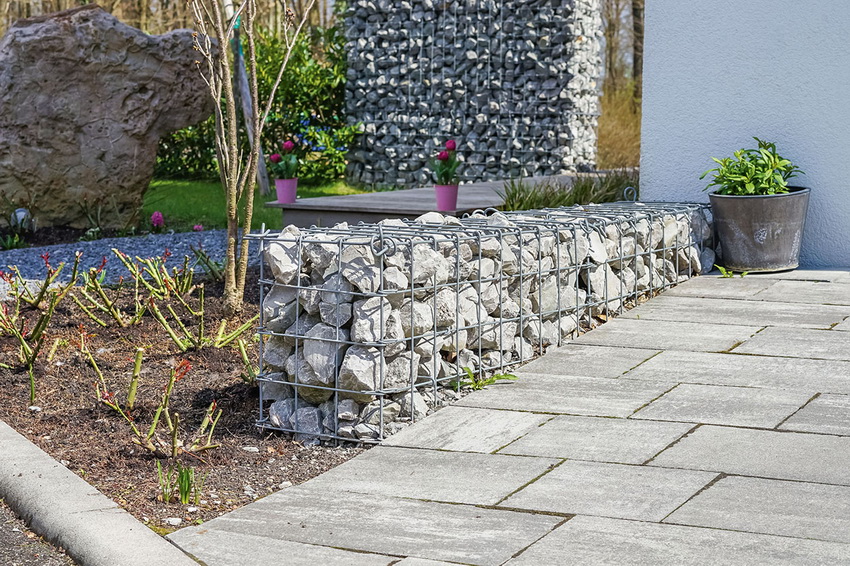 Габионы могут быть использованы в качестве подпорных стен, основания для заборов, просто декоративным элементом разделяя разные зоны участка.