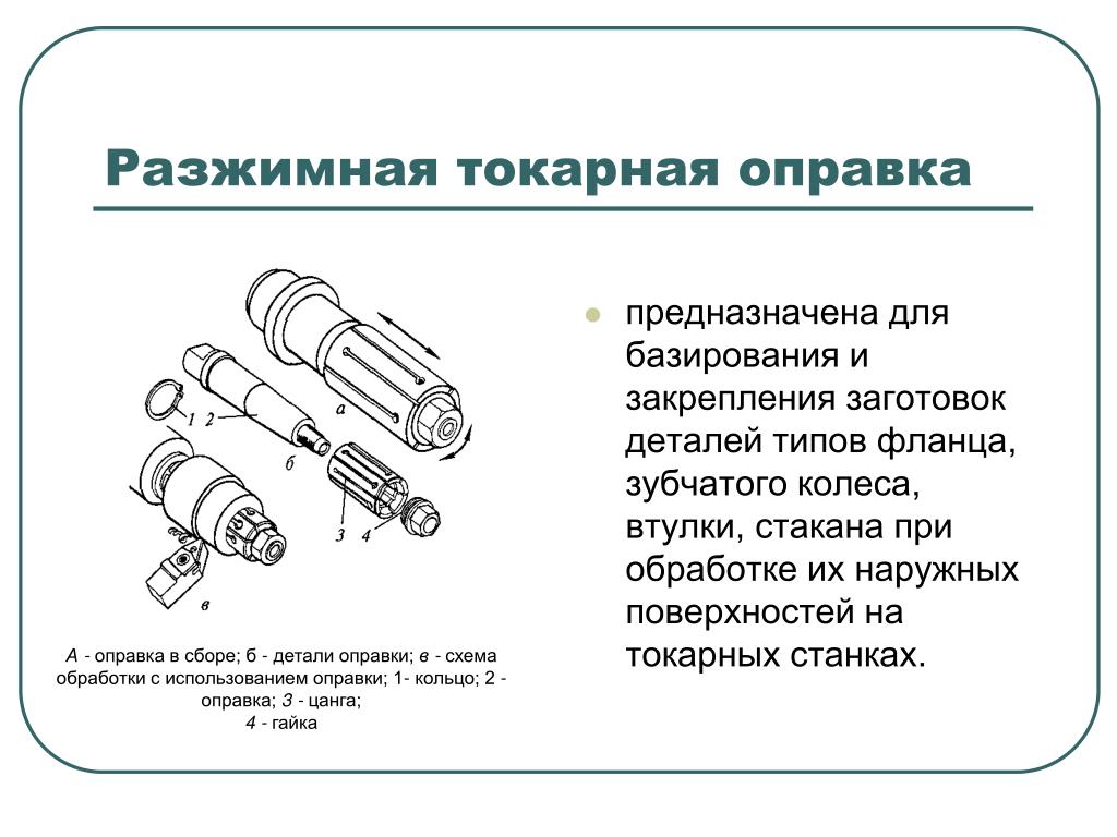— Оправка: зажим внутренней обрабатываемой детали между центрами для дальнейшей обработки, концентричной с отверстием, типы оправки, включая плоскую оправку, расширяющуюся оправку, групповую оправку, укороченную оправку.