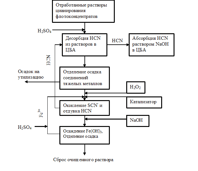 Шламы и растворы хвостов, содержащие выщелоченный материал, воду и остаточный цианид, обрабатываются различными химическими и физическими методами для уменьшения или удаления цианида, оставшегося в процессе растворения золота, перед сбросом в хвостохранилище. Кроме того, используются различные технологии для извлечения и повторного использования остаточного цианида в вышеупомянутых технологических схемах.