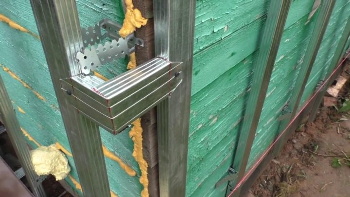 Закрепляем кронштейны. После их установки монтируются плиты утеплителя. Плиты крепятся к основанию полиамидными дюбелями, тарельчатого типа. Для защиты утеплителя от ветра и влаги необходимо покрыть его ветровлагозащитной пленкой. Следующим шагом будет крепление направляющих П-образной формы к кронштейнам. Для закрепления направляющих обычно используют заклепки. Направляющие служат для выравнивания стены. Между пленкой и направляющими необходимо оставить воздушный зазор. После чего приступаем к креплению П-образных горизонтальных профилей. Данные профили крепятся к вертикальным направляющим. Шаг крепления выбирается в зависимости от используемого профлиста, рассчитайте шаг так, что бы профнастил был жестко зафиксирован. Стеновой профнастил крепится самонарезающими шурупами с прокладками уплотнителями.