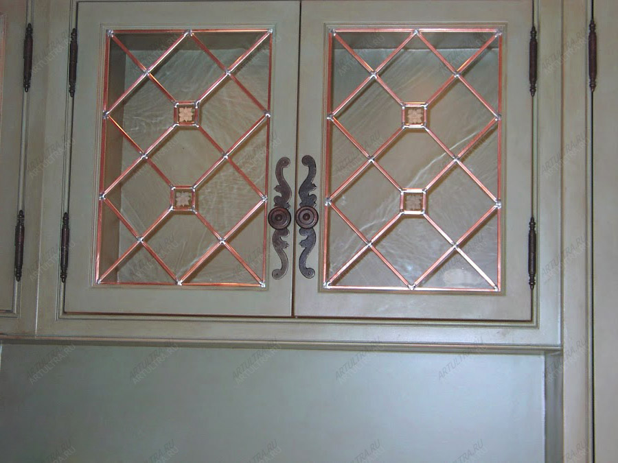 Профиль витражного остекления шириной 17 мм более изящен, но вместе с тем и прочен, упруг и пластичен. Из этого тавра легко скатать нужный радиус и выполнить фигурную латунную раму. Поэтому этот витражный профиль мы рекомендуем использовать для внутренних переплетов рамы.