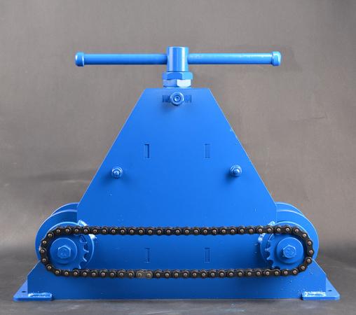 - Устанавливаете на силовую раму станка вальцы соответвующие размерам обрабатываемой трубы. С помощью домкрата прижимайте её между ведущим вальцом и прижимными вальцами.