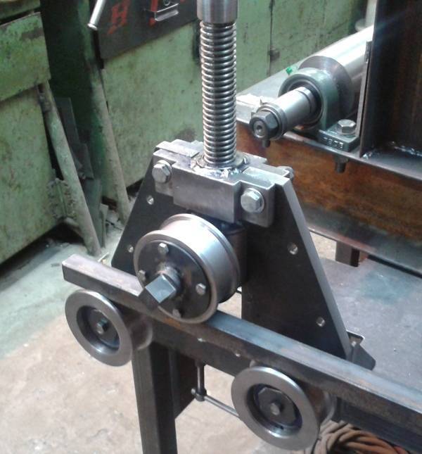 Когда работа завершена, можно приступать к испытанию устройства. Достаточно взять любой профиль и положить его на станок. Затем с помощью вращения ручки придать ход валам и тем самым выполнить изгиб трубы. Легко и быстро профиль приобретает необходимый радиус изгиба.