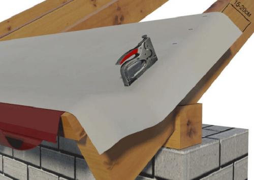 Защитная пленка укладывается с небольшим нахлестом (от 10 до 15 сантиметров). Еще нужно сохранять провис около 2 см между стропилами. Листы в местах нахлеста фиксируются на двухсторонний скотч.