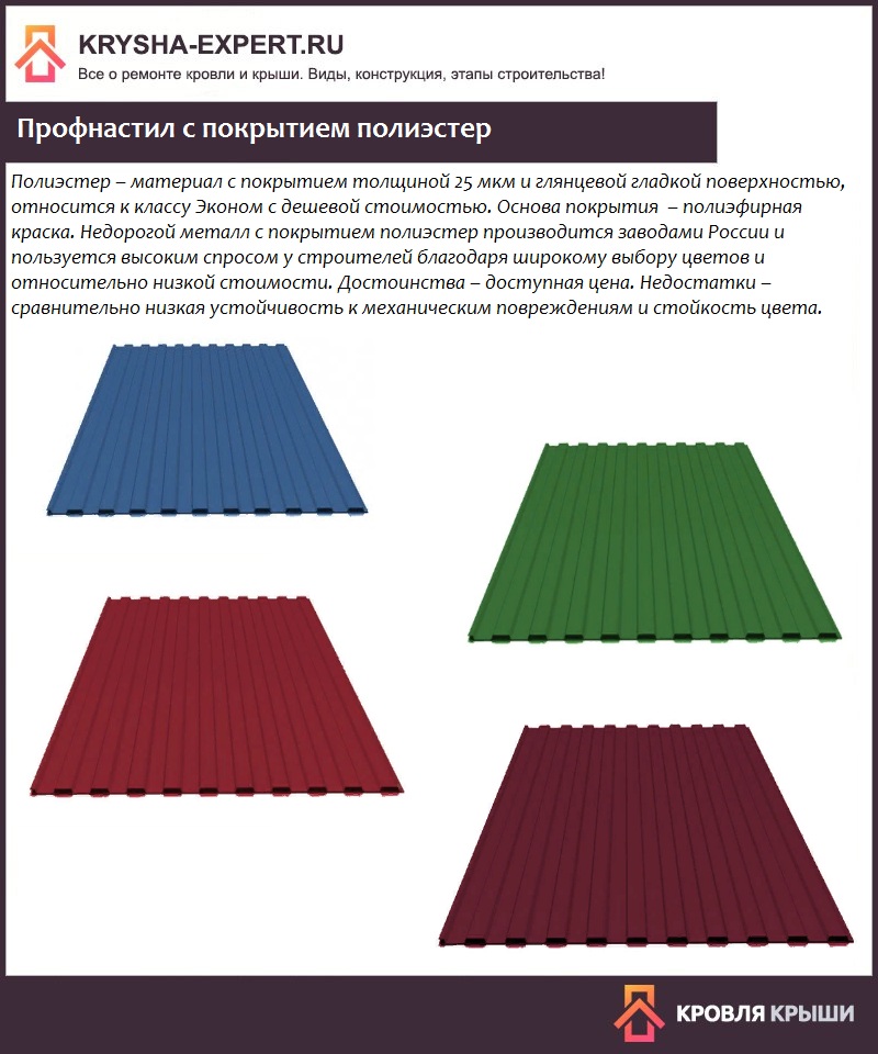 | Полиэстер | Наиболее популярный материал, которым покрывают профнастил. | Высокие декоративные свойства, большая палитра оттенков (зеленый, красный, белый, синий и так далее), устойчивость к температурным перепадам, хорошая адгезия | Высокая стоимость металлоизделия. |