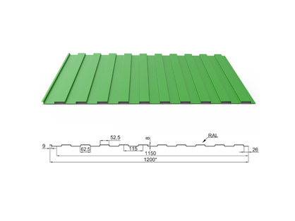 Ведение работ облицовочного характера осуществляется посредством использования стеновых профилированных листов, имеющих самую маленькую высоту волны – 8 — 44 мм. Примером маркировки стенового настила является профнастил С10-1150, где С- указывает на то, что материалом осуществляют облицовку стен, 10 — высоту волны, «монтажная ширина»- 1150. Профиль предполагает использование в производстве образцов стали 0,45-0,7мм. Рабочая ширина единицы – 1250мм, размер длины до 12 м допуская нужное отрезание пошагово.