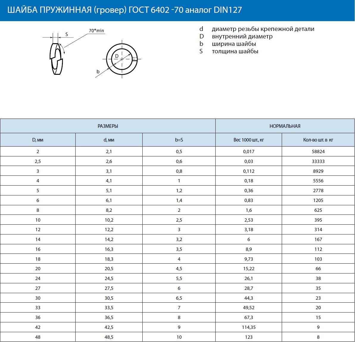 Ниже приведены основные размеры и характеристики шайб гровера ГОСТ 6402-70 исполнения 1.