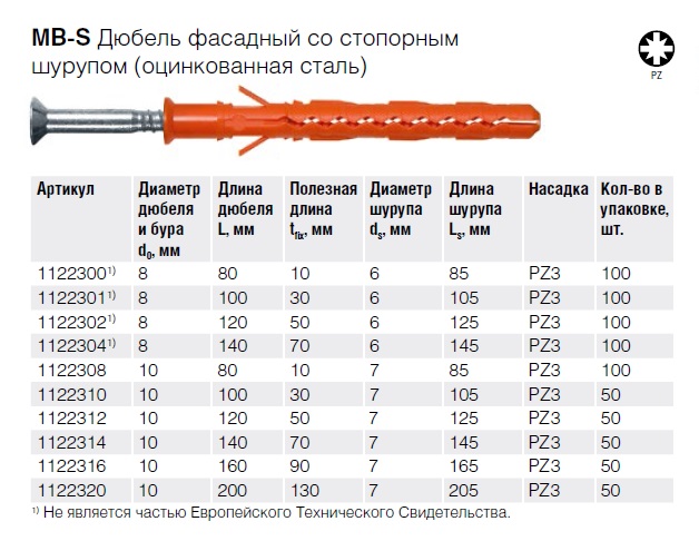 | Размер | Диаметр дюбеля, мм | Диаметр шурупа, мм | Количество в упаковке, шт |