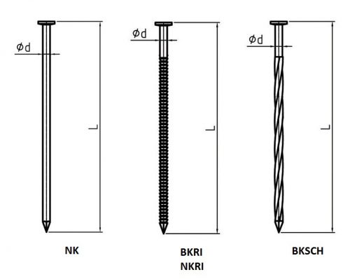 Строительные гвозди изготавливают из проволоки и в зависимости от диаметра стержня имеют плоскую или коническую головку. Если диаметр стержня до 1,6 мм, то головку делают плоской, а 1,6 мм и свыше – конической. Диаметр шляпки с плоской головкой равен двум диаметрам стержня. Для конической головки это отношение может немного уменьшаться с увеличением диаметра стержня.
