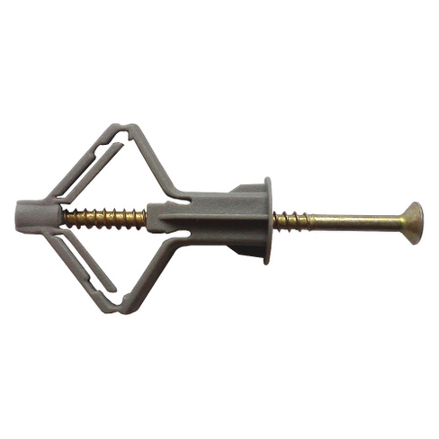 - Крепёж-бабочка. Втулка крепежа, чаще всего металлическая, при установке складывается, отчего этот вид и получил своё название. Используется для тонкотелых и пустотелых стен.