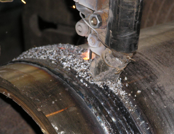 При указанном виде наплавки электрическая дуга горит под слоем флюса, подаваемого в зону наплавки. В зоне горения дуги оплавляются поверхность детали, электрод и прилегающий слой флюса. Электродная проволока по мере оплавления автоматически подается в зону дуги одновременно с флюсом. При плавлении флюса образуется газовая оболочка, защищающая расплавленный металл от взаимодействия с окружающим воздухом и выгорания легирующих элементов. Флюсовое покрытие способствует сохранению тепла дуги и препятствует разбрызгиванию жидкого металла. Шлаковая корка, образующаяся при остывании, снижает скорость охлаждения наплавленного металла, что создает благоприятные условия для формирования шва. Этим способом можно наплавлять разные поверхности в несколько слоев. Толщина слоя наплавки практически не ограничена. Для питания дуги используется постоянный ток обратной полярности. Наплавку можно производить как на универсальном оборудовании так и на специализированных установках.