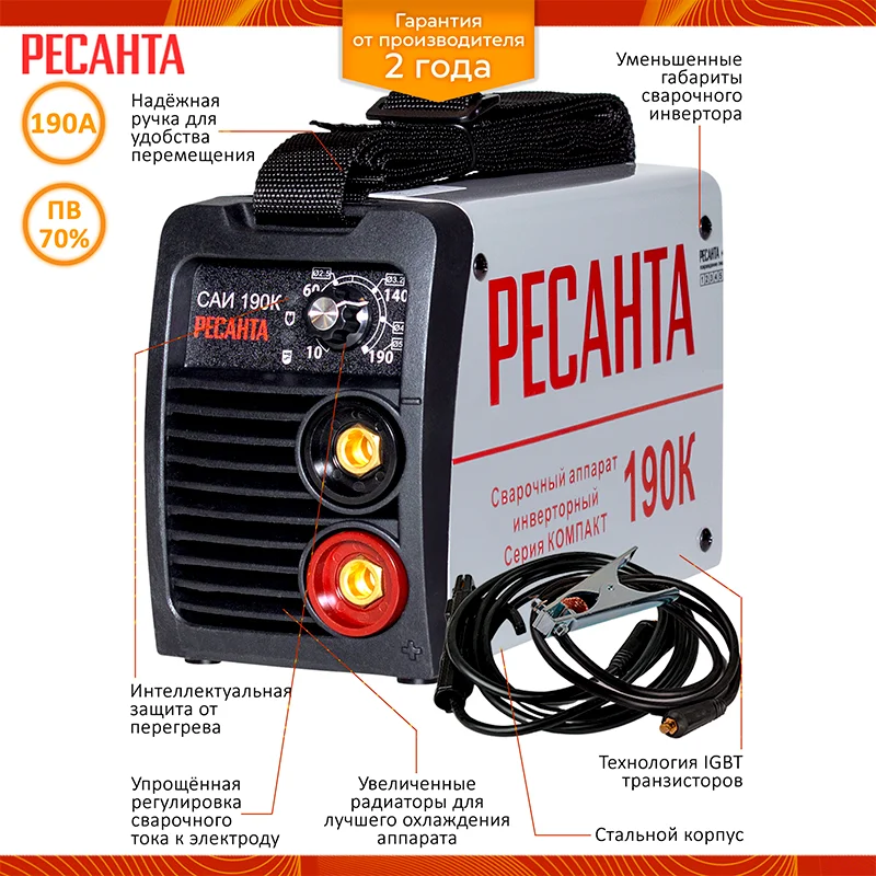 - Удлиненный кабель с электрододержателем. Аппараты Ресанта серии ПН комплектуются 3-метровым кабелем с электрододержателем, что позволяет выполнять больший объем работ без перемещения аппарата