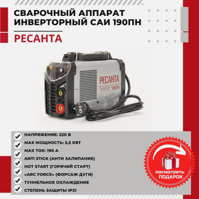 Сварочный аппарат пониженного напряжения Ресанта САИ-190ПН — передвижная электростанция, вырабатывающая электрический ток для электродуговой сварки или резки металла. Сварочники серии «ПН» отличаются наличием информационного дисплея, эргономичным дизайном, обеспечивающим лучшее охлаждение системы. В САИ ПН добавилась регулируемая функция форсажа дуги «ARCFORCE», которая предназначена для повышения устойчивости сварочной дуги и лучшей текучести металла.