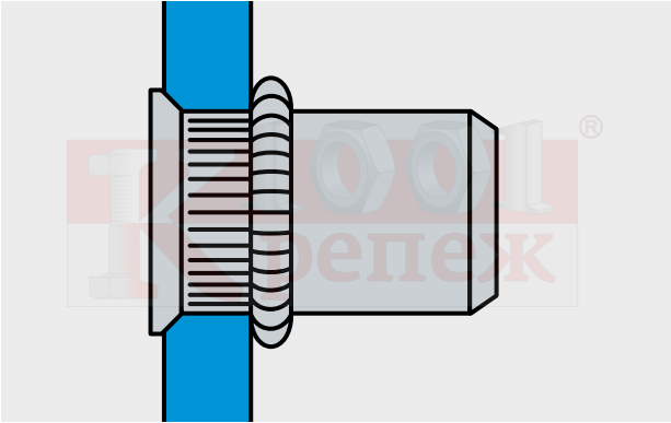 - Может использоваться как заклепка для соединения двух и более материалов и как гайка для крепления ответной части винтом.
