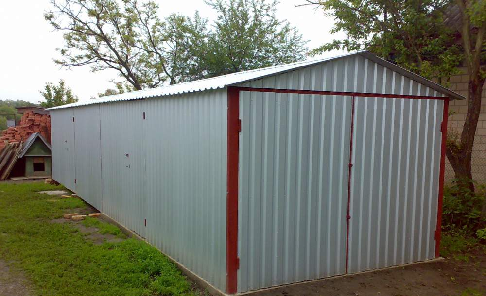 Металлическая постройка собирается из профилированной трубы и листового железа. Чаще используется профлист, так как благодаря рельефной поверхности он прочнее и лучше переносит ветровые нагрузки.