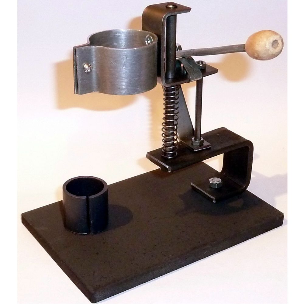 Фиксирующее устройство можно изготовить на основе металлической пластины с 4 крепежными отверстиями и обычной струбцины. Также вполне реально купить уже готовый механизм в магазине. Для его установки потребуется просверлить несколько отверстий в металлической основе станка.