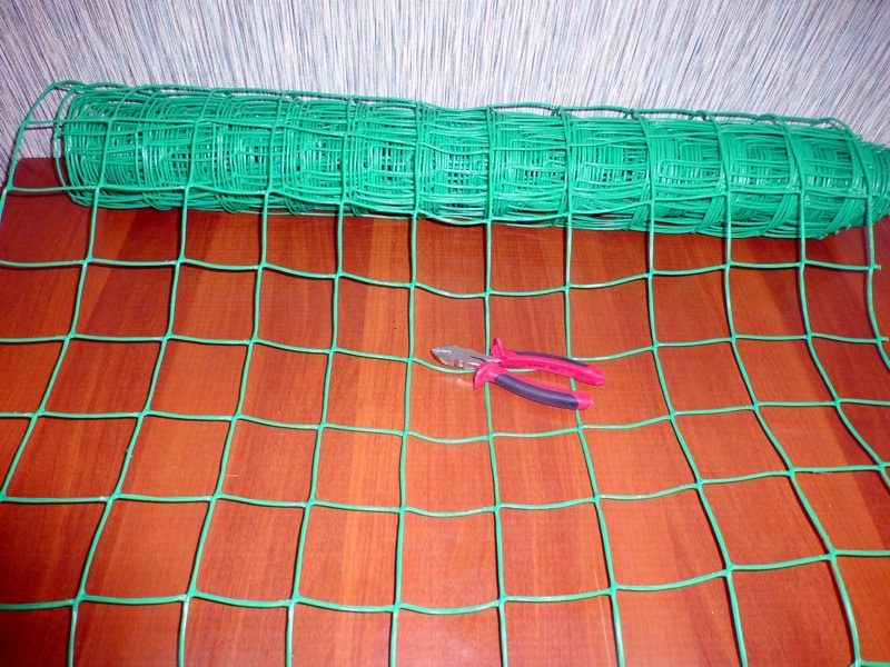Земля вокруг опор тщательно утрамбовывается. Если грядка имеет длину более 10 метров, то устанавливают дополнительный столб. - Сетка. Она может быть металлической, пластиковой, выполненной из натурального волокна, а также из деревянных брусков. Ее плетение должно быть крупным.