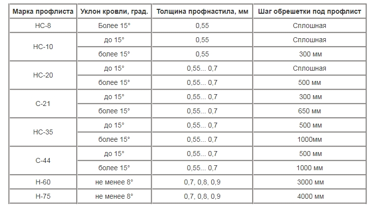 Как вы можете увидеть в приведённой ниже таблице, данный нормативный документ устанавливает зависимость расстояния между прогонами от используемой марки профнастила. Чем толще профнастил и чем он выше, тем больше допустимое расстояние между прогонами.